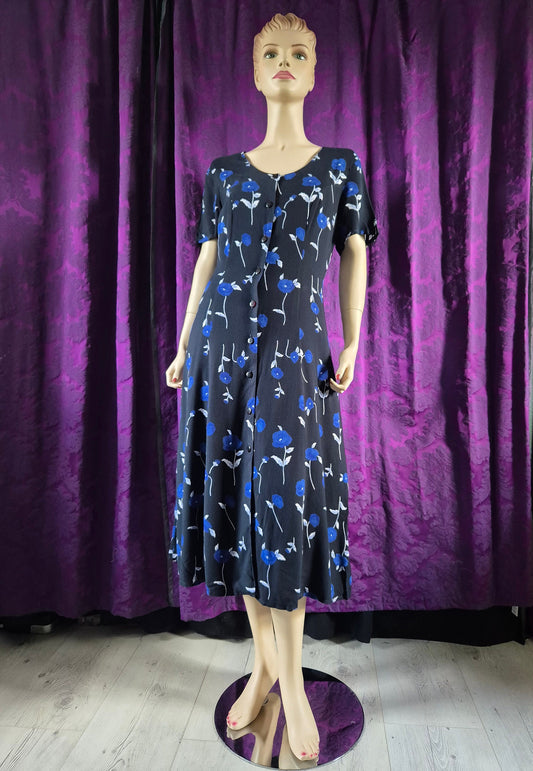 Vintage 1990s Blue and Black Floral Goth Tea Dress