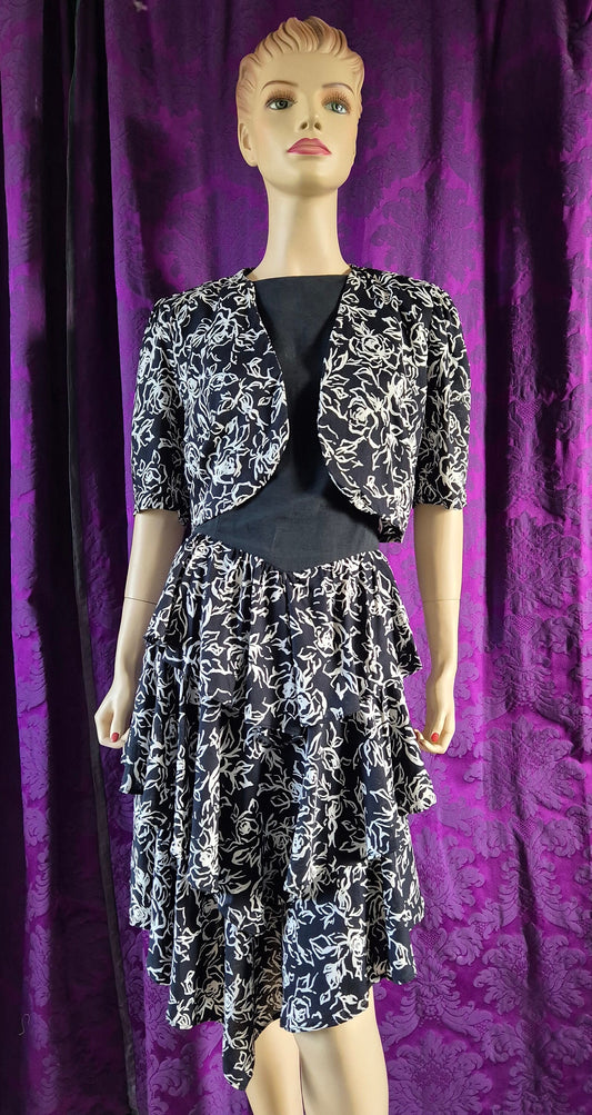 Vintage Early 1990s Black & White Floral Ruffled Dress & Bolero