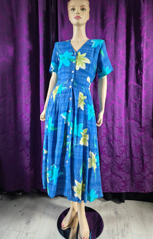 Vintage 1990s Blue Daisies Rayon Midi Dress by C&A