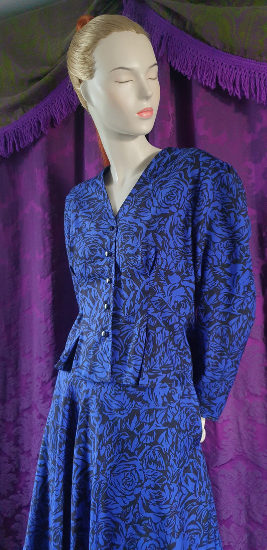Vintage Royal Blue Floral Blouse and Full Skirt Suit by Windsmoor