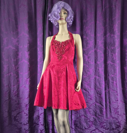 • Vintage 90s Red Brocade Fit & Flare Party Dress - Halloween Devil Costume - Sabrina