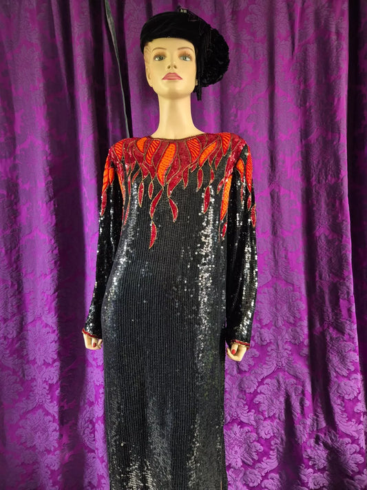 Vintage 1980s Hilary Floyd Sequin Satin Flames Dress