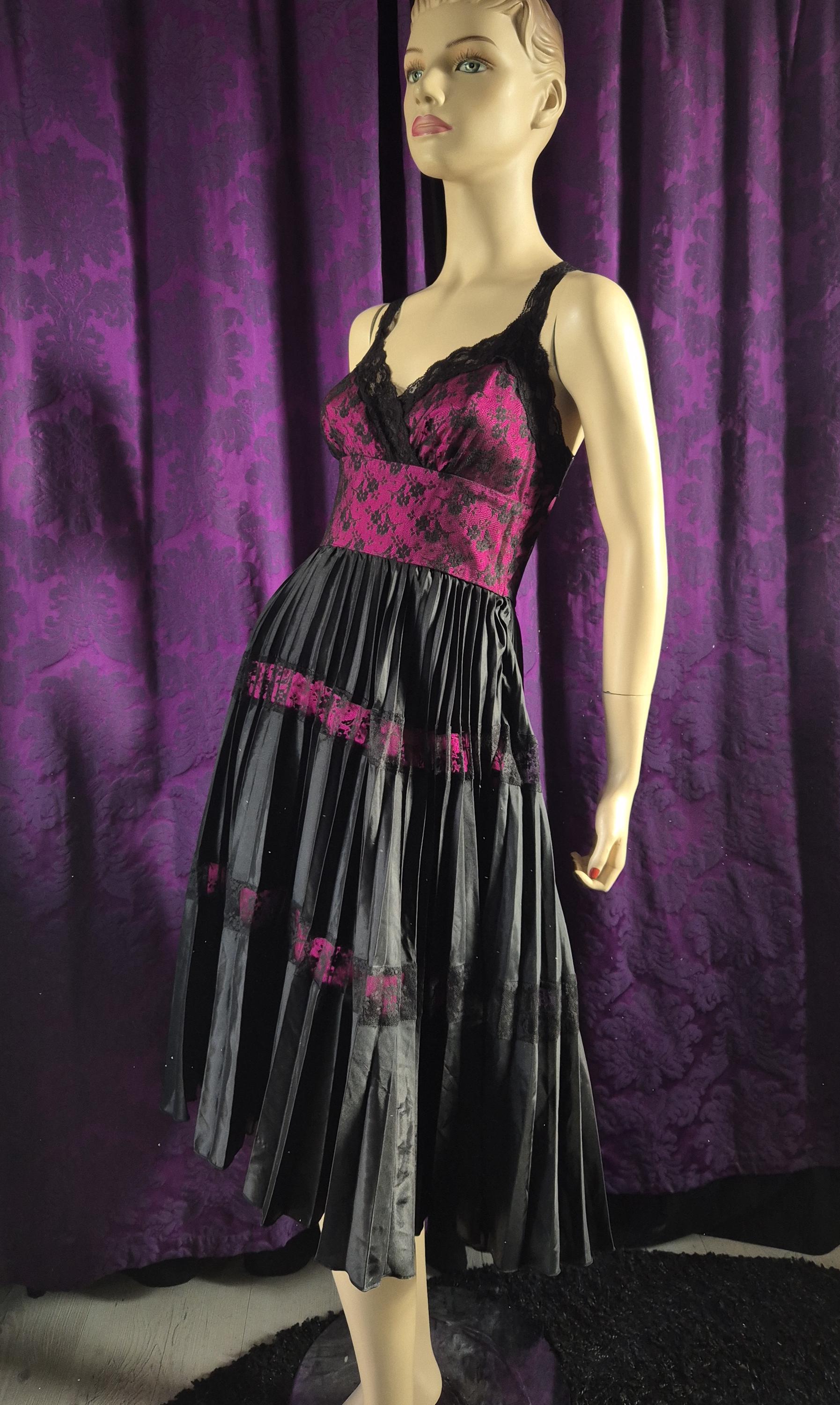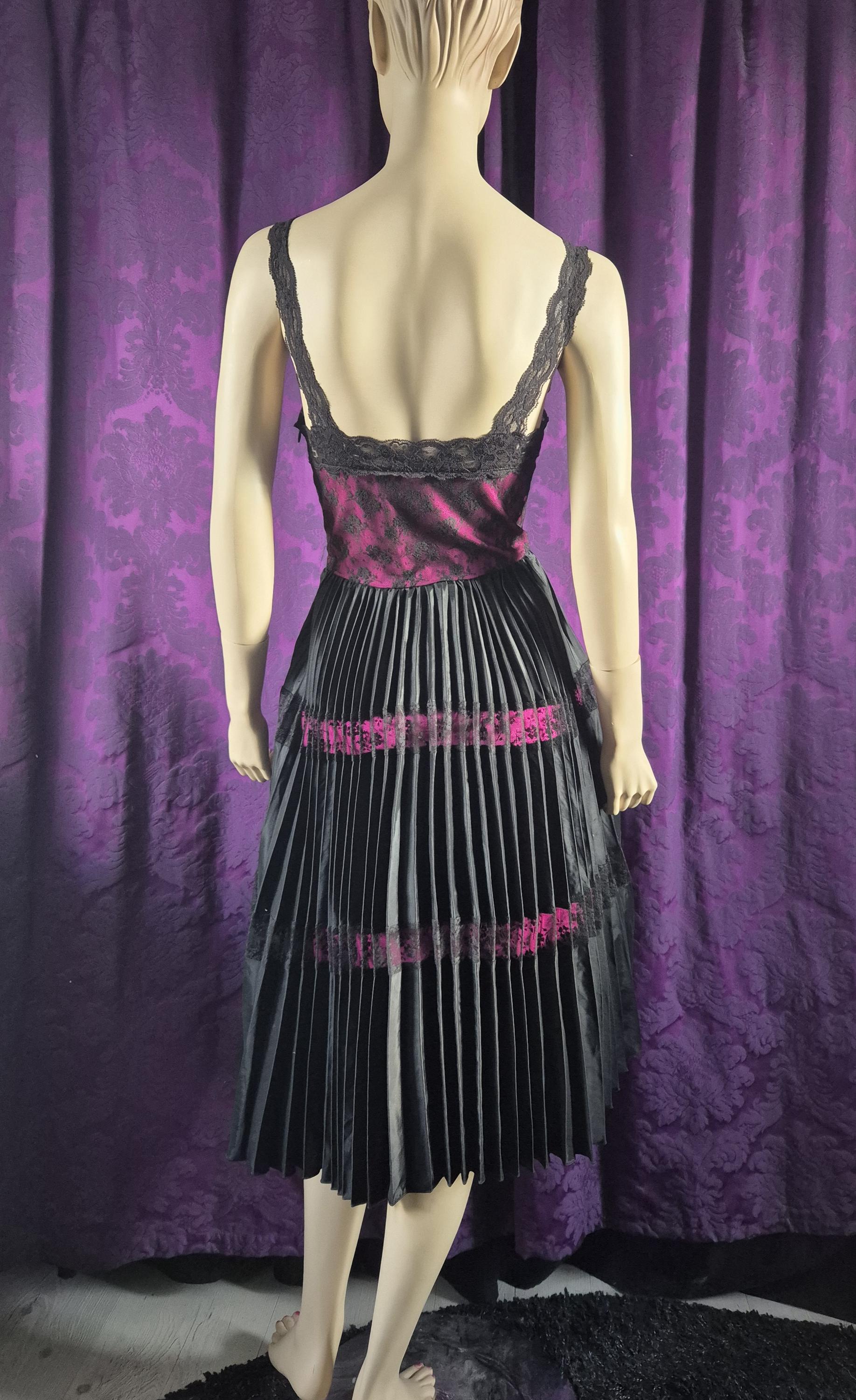 Stunning, iconic style Betsey Johnson New York fuchsia and black slip style prom dress. Lace bodice and insets over a lampshade pleated satin skirt. Very lingerie inspired, and definitely a high voltage and playful occasion dress.