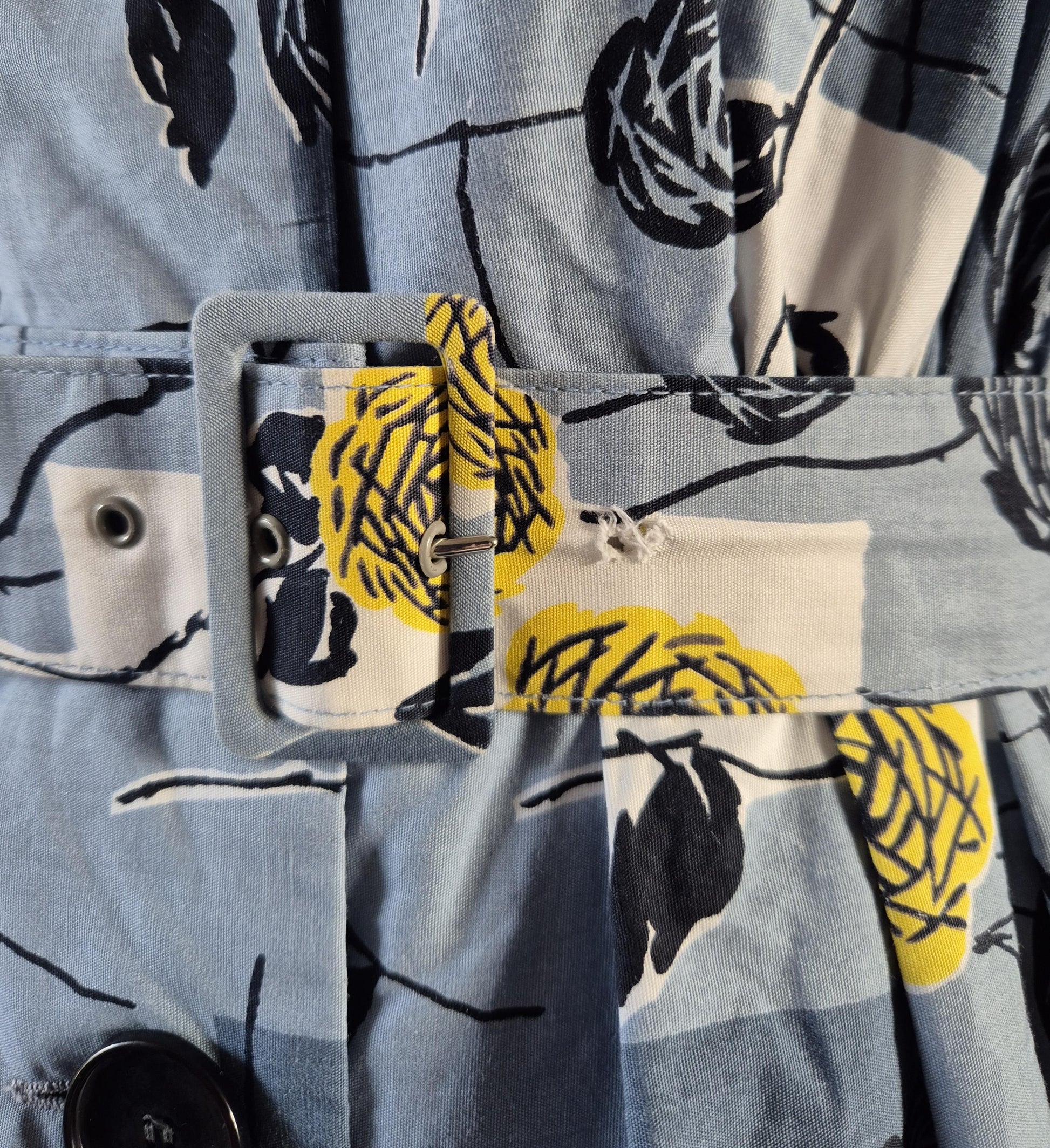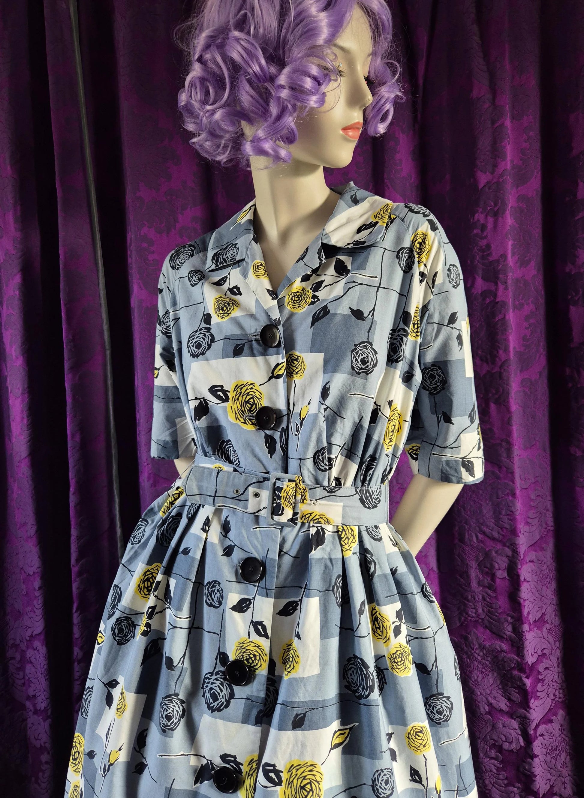 An utterly superb 1950s shirtwaister! Floral and geometric print in signature midcentury graphic style and colour palette of slate blue-grey with black and sulphur yellow. the cotton is crisp and has a slight sheen and lots of body. The construction is perfect, with a relaxed fit bodice, raglan sleeves, and full pleated skirt. Self fabric belt and jumbo buttons. It is in excellent condition (I almost mistook it for a modern reproduction at first!), and the only flaw is a missing grommet on the smallest belt hole (see in last photo). Skirt section has a gauze lining / petticoat. Photos were taken with a slightly fuller petticoat underneath (not included).