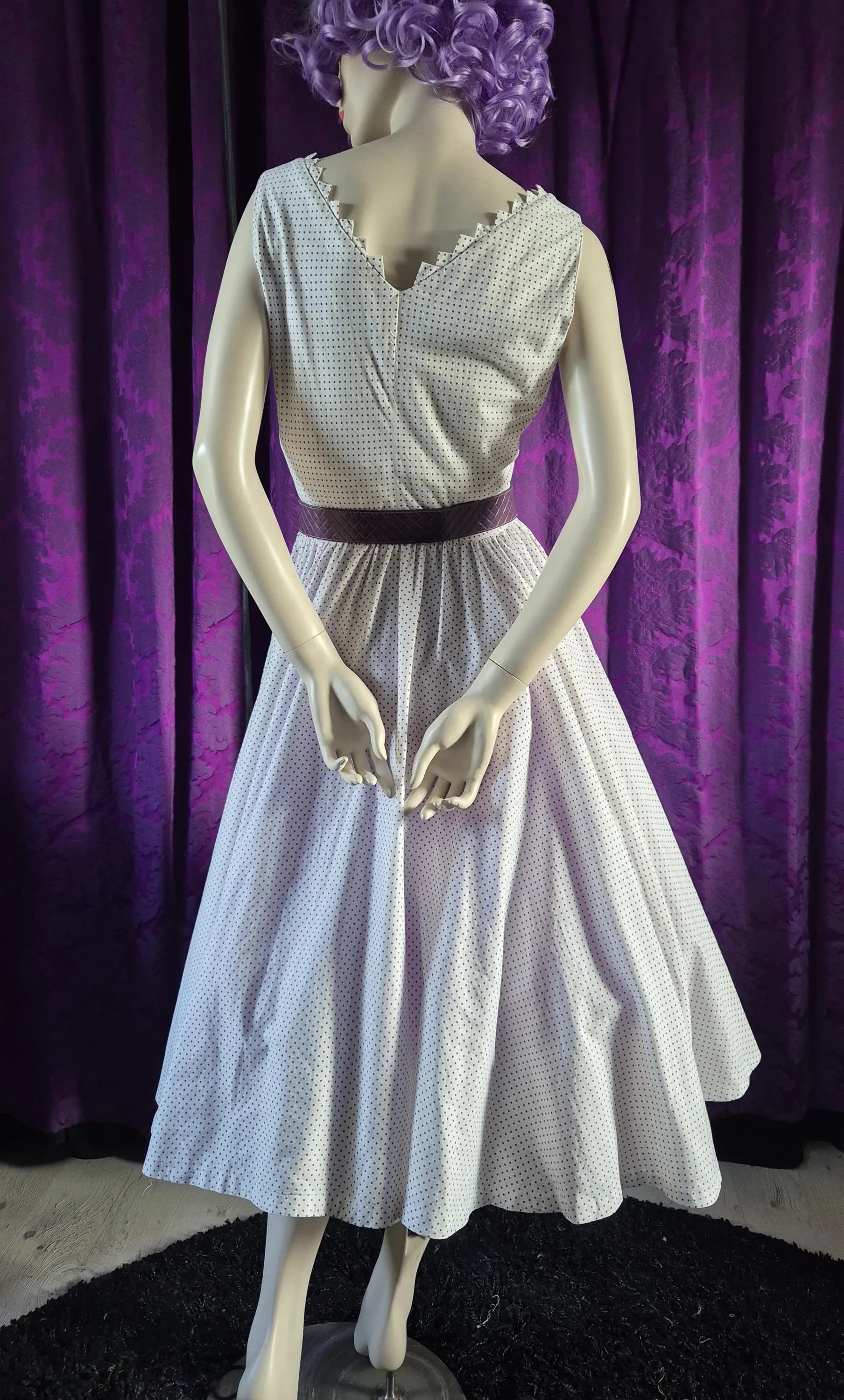 This demure and flattering 1950s handmade dress is so pretty in its simple glamour! Perfect for vintage weddings, and special occasions and can be styled up or down with period or modern accessories. Off shite with dark brown dots. Lovingly handmade with the labour intensive zig zag detail around the neckline. Fitted bodice cut on bias, and a full circle skirt. Pockets in the side seams, string belt loops and side metal zipper. Excellent vintage condition.