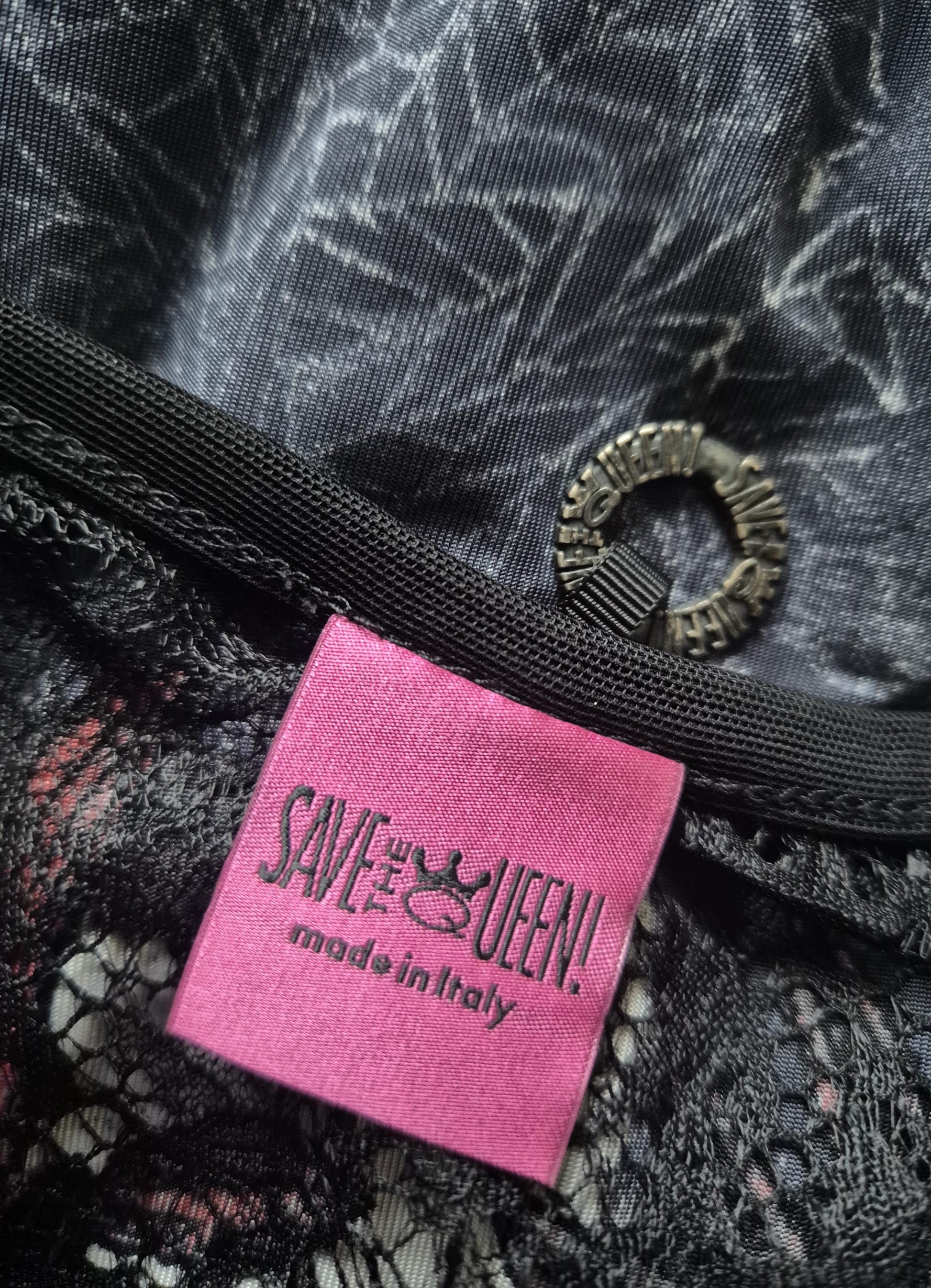 Stunning SAVE the QUEEN co-ord. Jersey print dress with Japanese style floral and red & white crochet lace border. Back lace panel and mesh straps. Topped off with a cropped lace bolero. with red topstitching. Dress has mesh skirt lining. A signature piece by the iconic label, circa early 2000s.