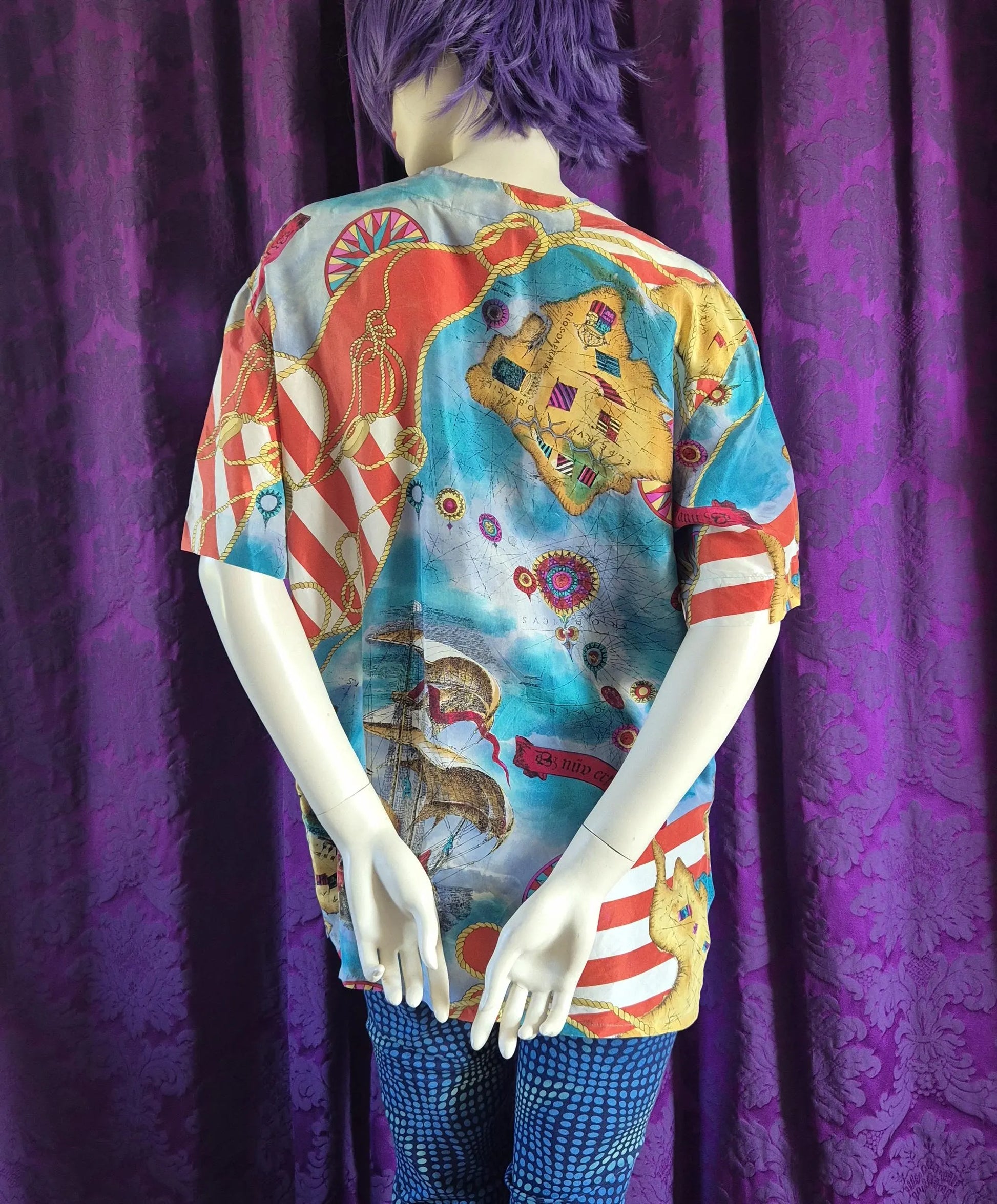 Another amazing Betty Barclay print! Vibrant silk print featuring antique maps, sailing ships and other nautical motifs. Light crisp pure silk with a pearlescent sheen. Perfect way to give nautical dressing a bit more heave ho than the usual stripes!