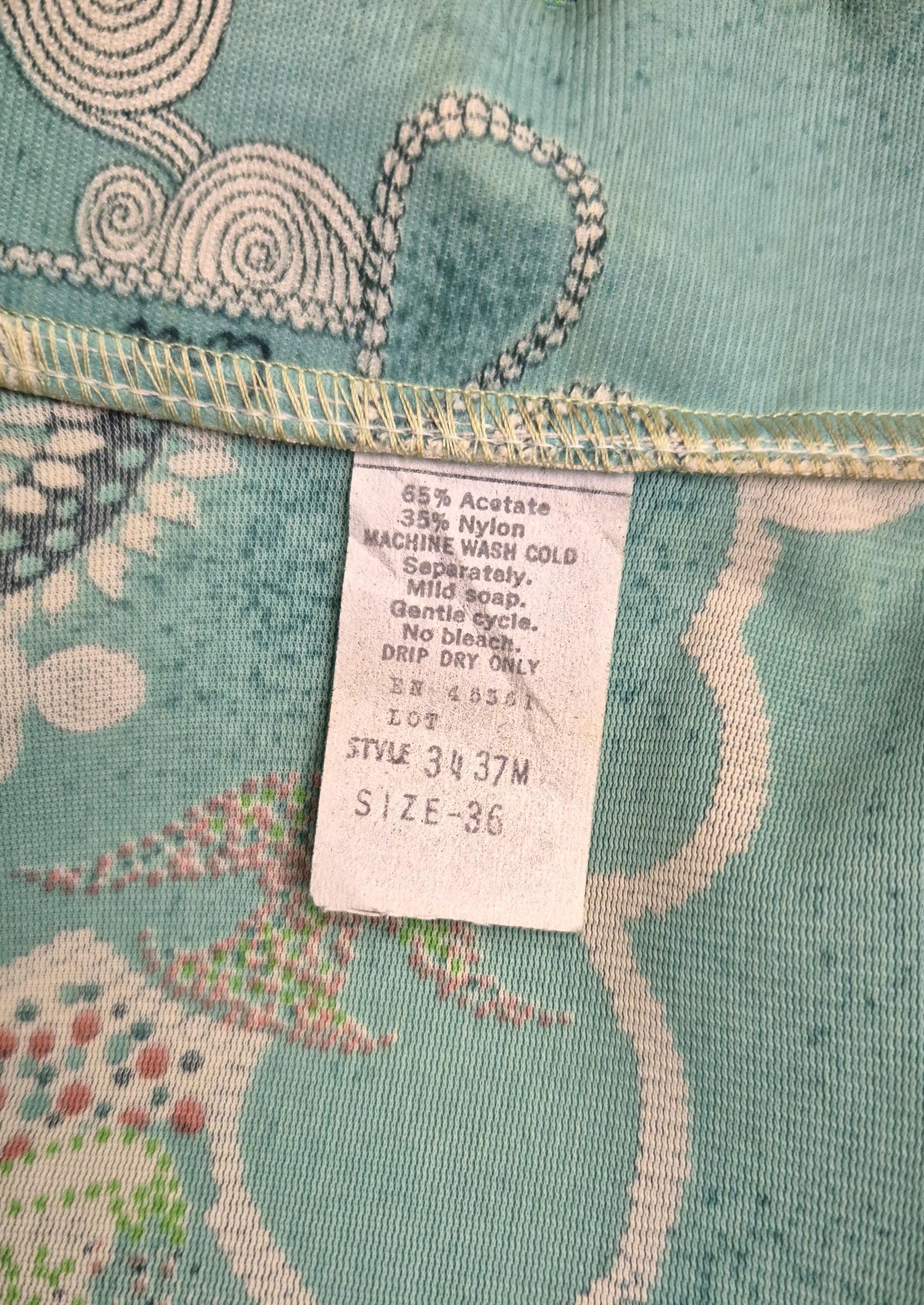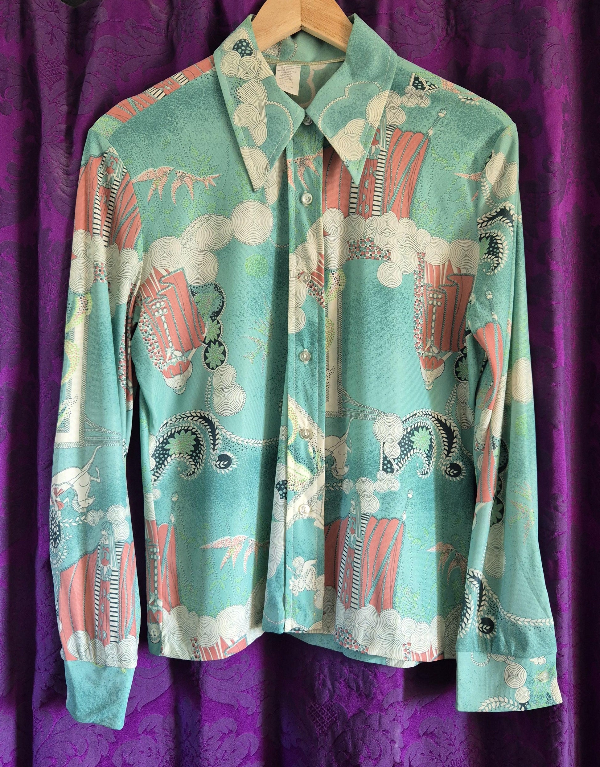 An utterly magical whimsical 1970s novelty print blouse featuring psychedelic infused art deco designs. This composite and very conversational print features, medieval maidens, Roman chariots, Zeus, swallows, swirls and a nude nymph surrounded by swirls of spots. A mix of pointilism, and graphic illustration style in macaroon colours. I've seen a lot of 1970s shirts in my decades on this planet but this one is truly out of this world!