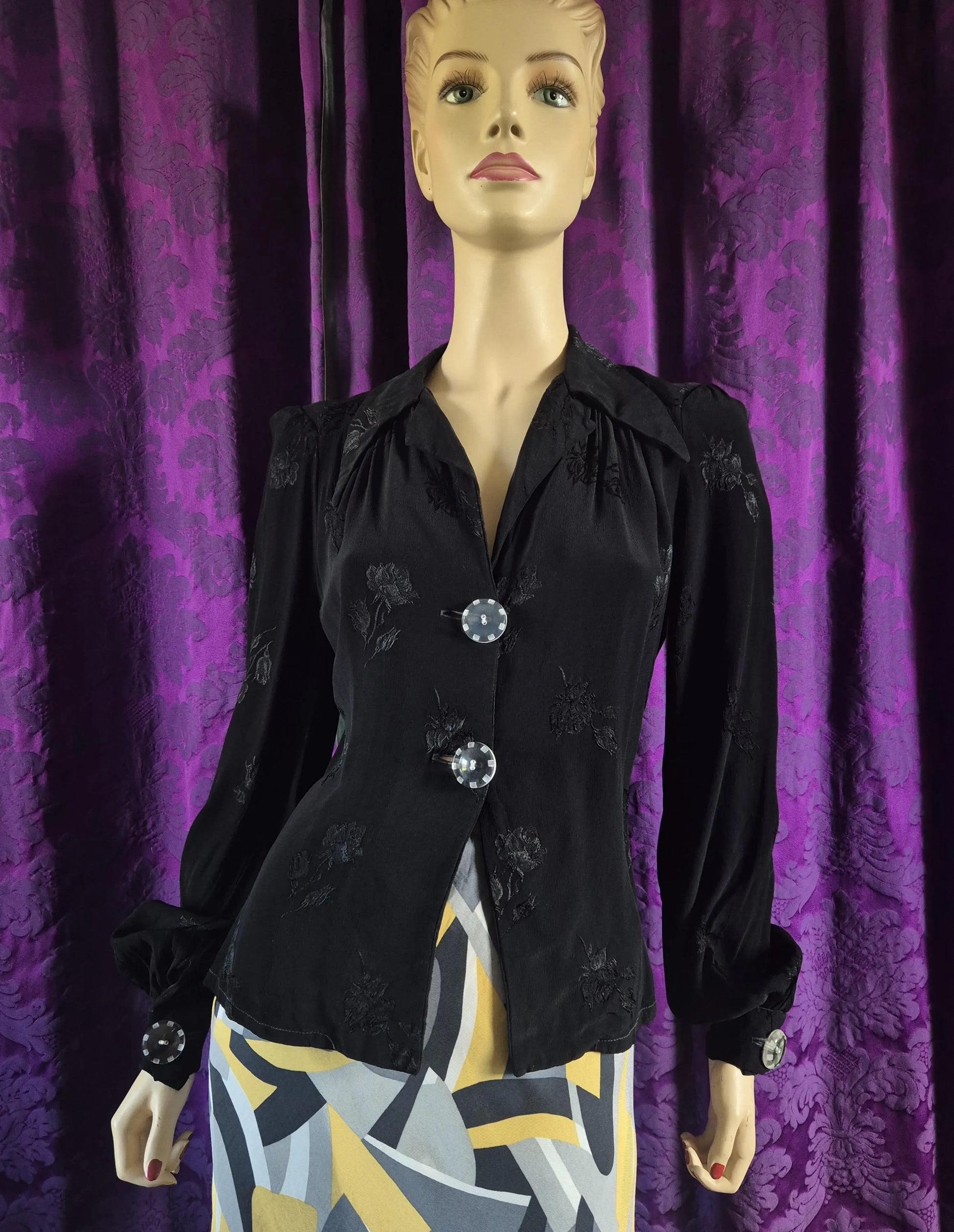 Exquisite rayon jacquard crepe tailored blouse by Chrisallis London that epitomises the 1940s revival styles of 1970s British boutique fashion. Elegant drape and attention to detail make this a luxe piece that is a joy to wear. The enormous lucite buttons might be older than the garment - dead stock from the 30s or 40s used cleverly to give the piece even more retro flair.
