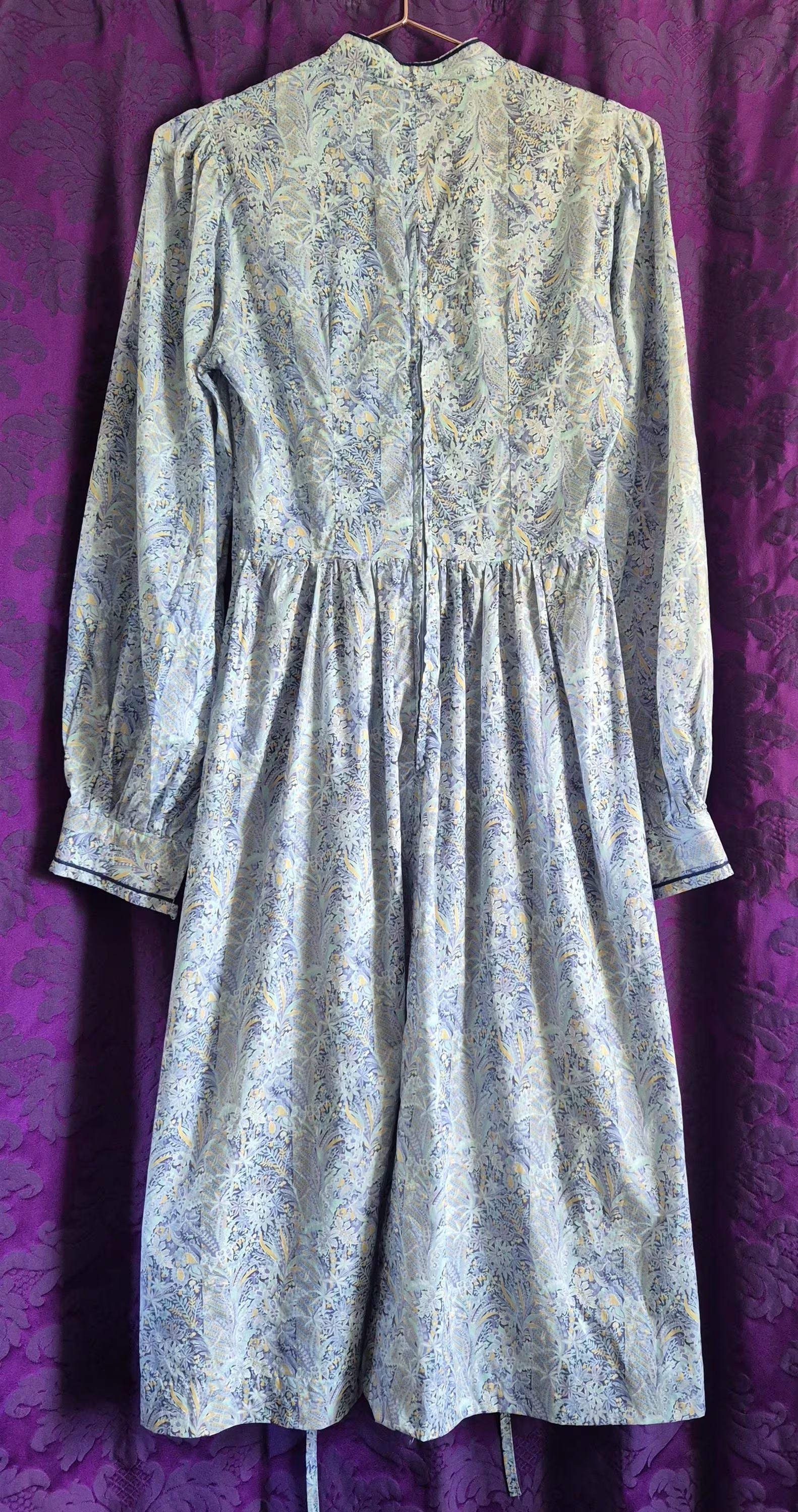 Gorgeous, romantic Liberty tana lawn print dress, with fitted quilted bodice, voluminous sleeves and full skirt. An utterly dreamy boho cottagecore piece, special enough for special occasions - like your wedding perhaps. A finely detailed floral print with geometric elements in shades of lilac, pale blue, and butter yellow. Navy blue piping and topstitching enhance the silhouette. Dome buttons down the front (functional) and a back zipper, and waist tie.