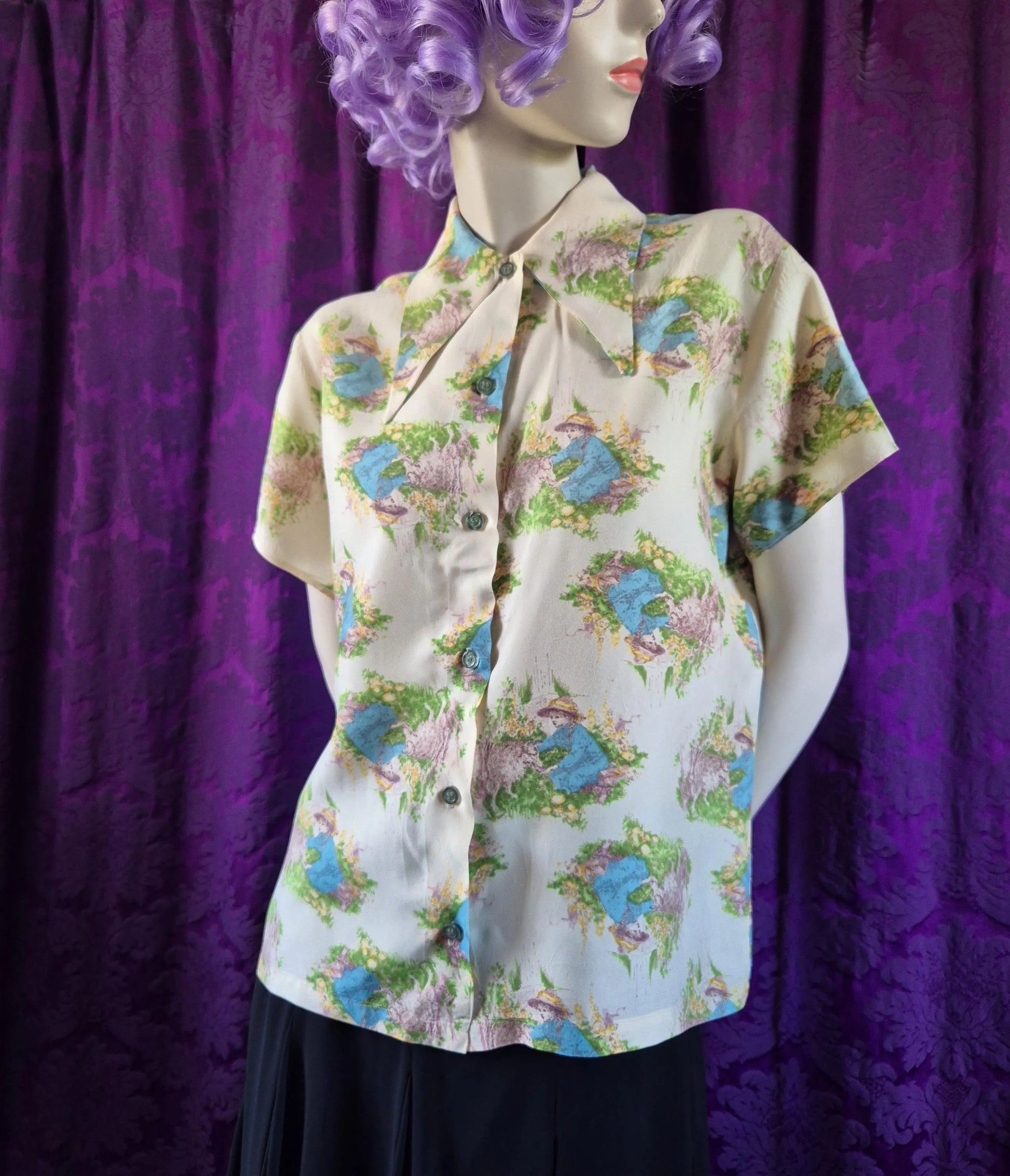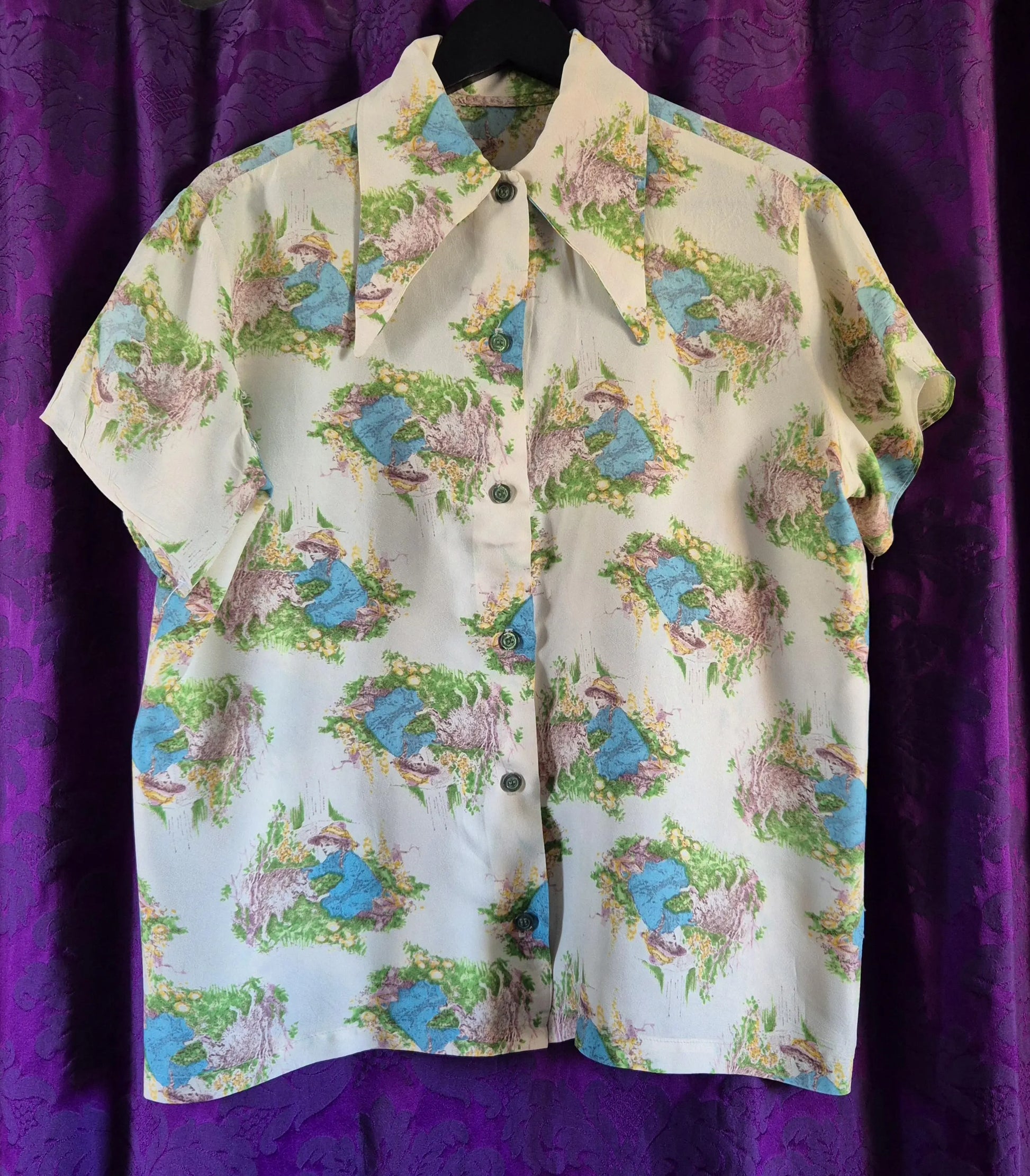 This charming 1970s blouse has an allover repeat print of a little girl and a little lamb - post-impressionist style storybook art. I wondered if it might be a copy of work by a famous artist, but could not match the design. Nevertheless, part of the vogue for art-inspired conversational prints in the 70s. Dagger collar, and iridescent green buttons. This blouse has been handmade and some aspects of the sewing are less than perfect - or have been repaired - one tiny hole close to the hem in front- but overall it is in very good condition. Fabric is matte synthetic silk - probably a nylon blend. An undeniably unique piece that has 70s nostalgia, and timeless charm.