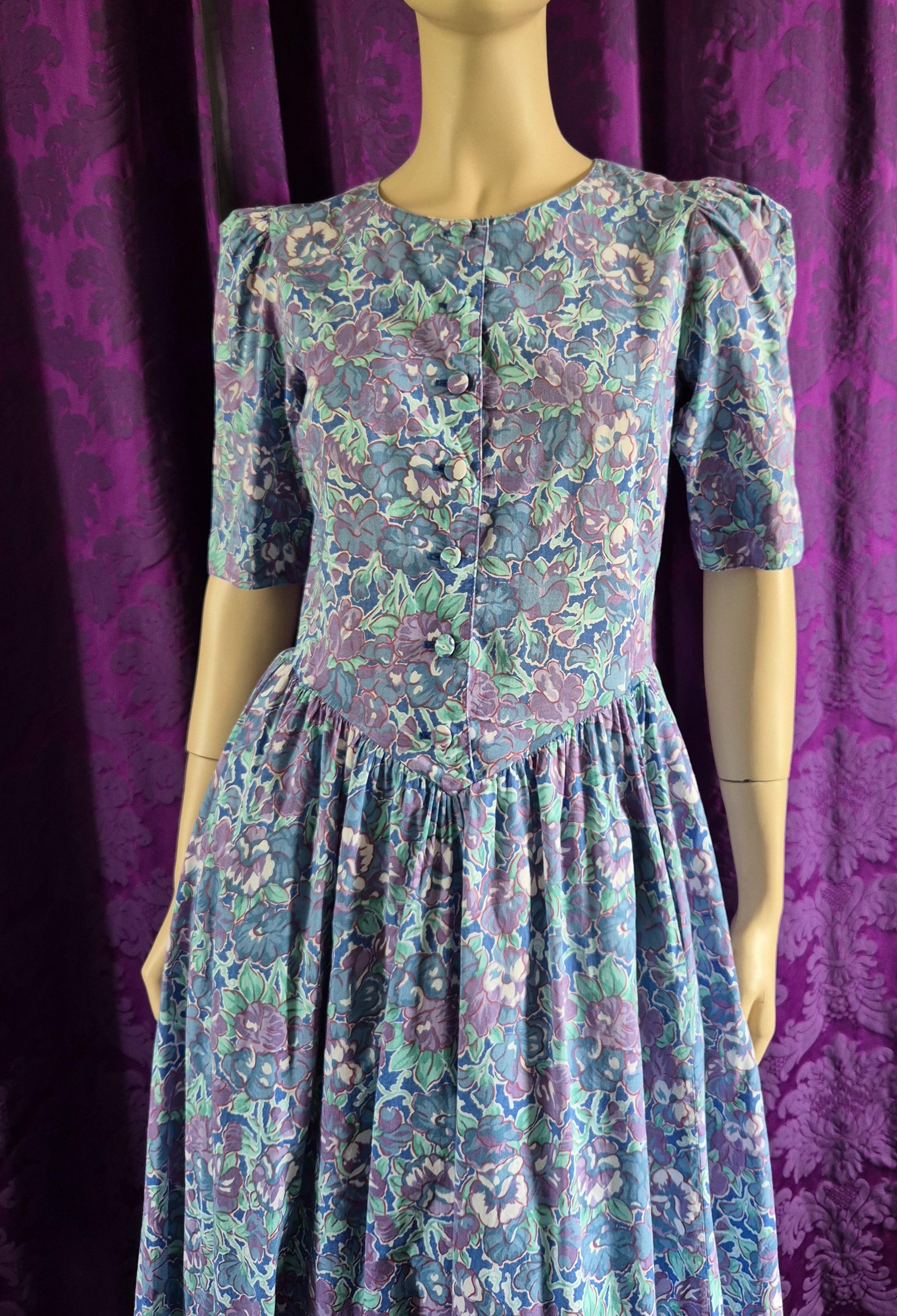 Delightful cotton floral dress in the style popularised by Laura Ashley - but no labels on this one. Lilac and blue flowers highlighted in rust give the print dimension and the silhouette is so very pretty! Fitted bodice with sweetheart neckline, puffed sleeve, pointed waistline and full gathered skirt. Little details make the look - self-fabric covered buttons and oh yes - it has pockets!