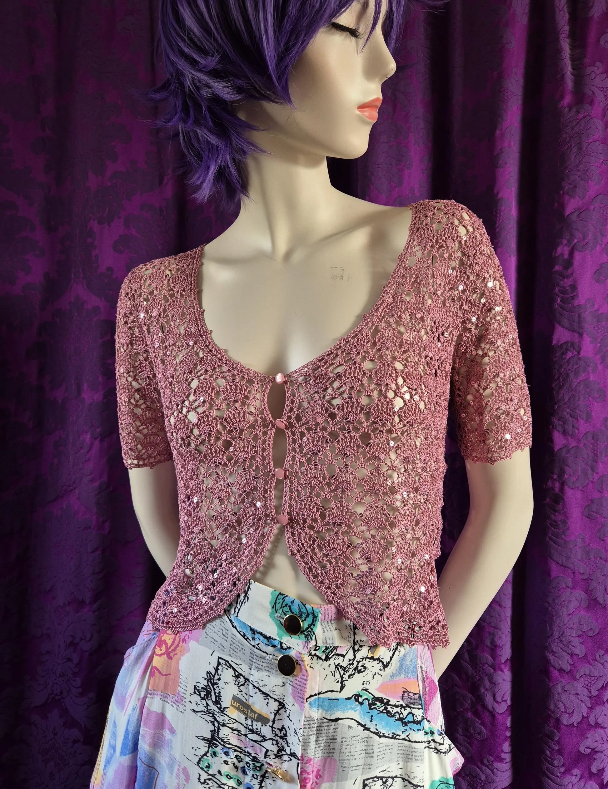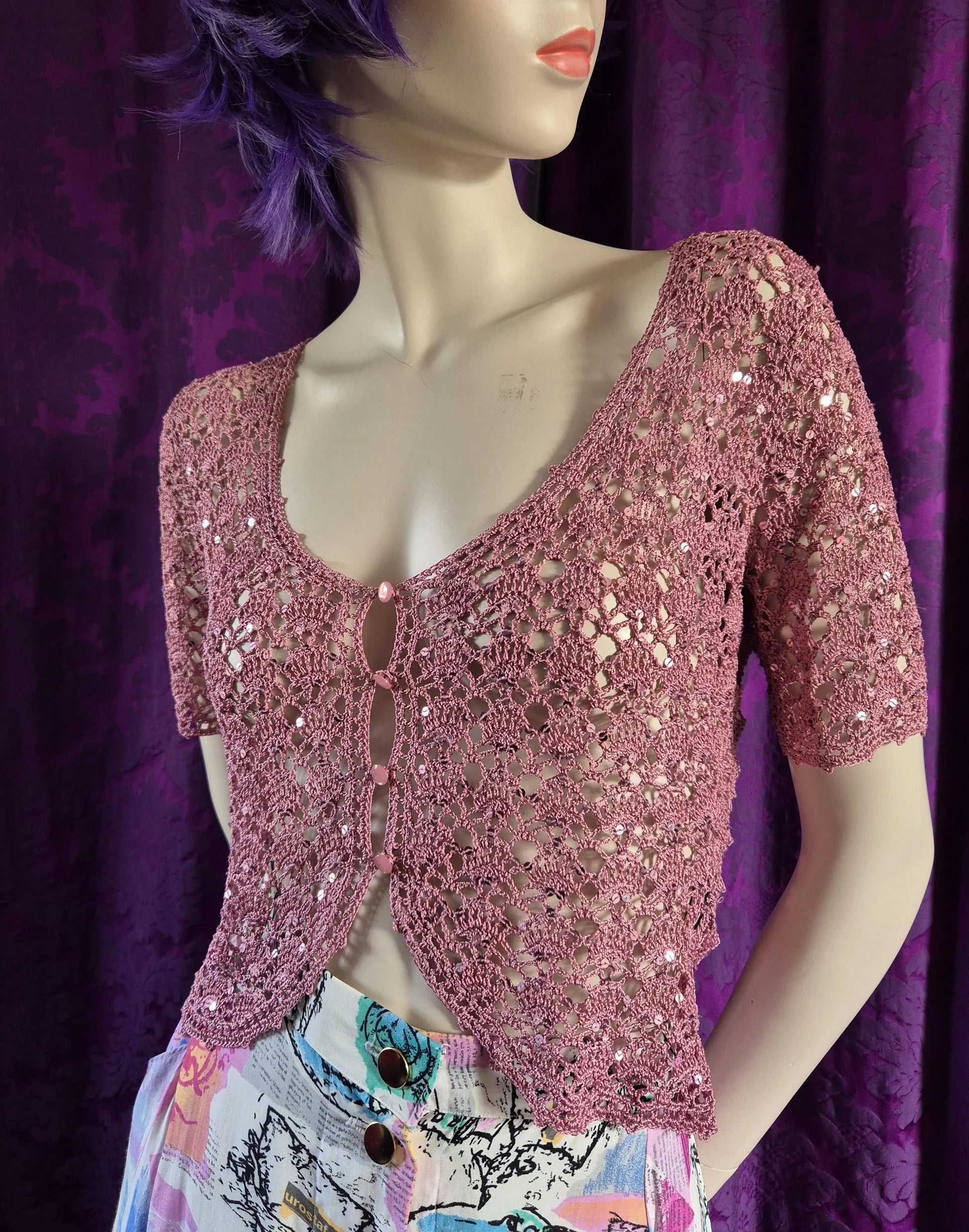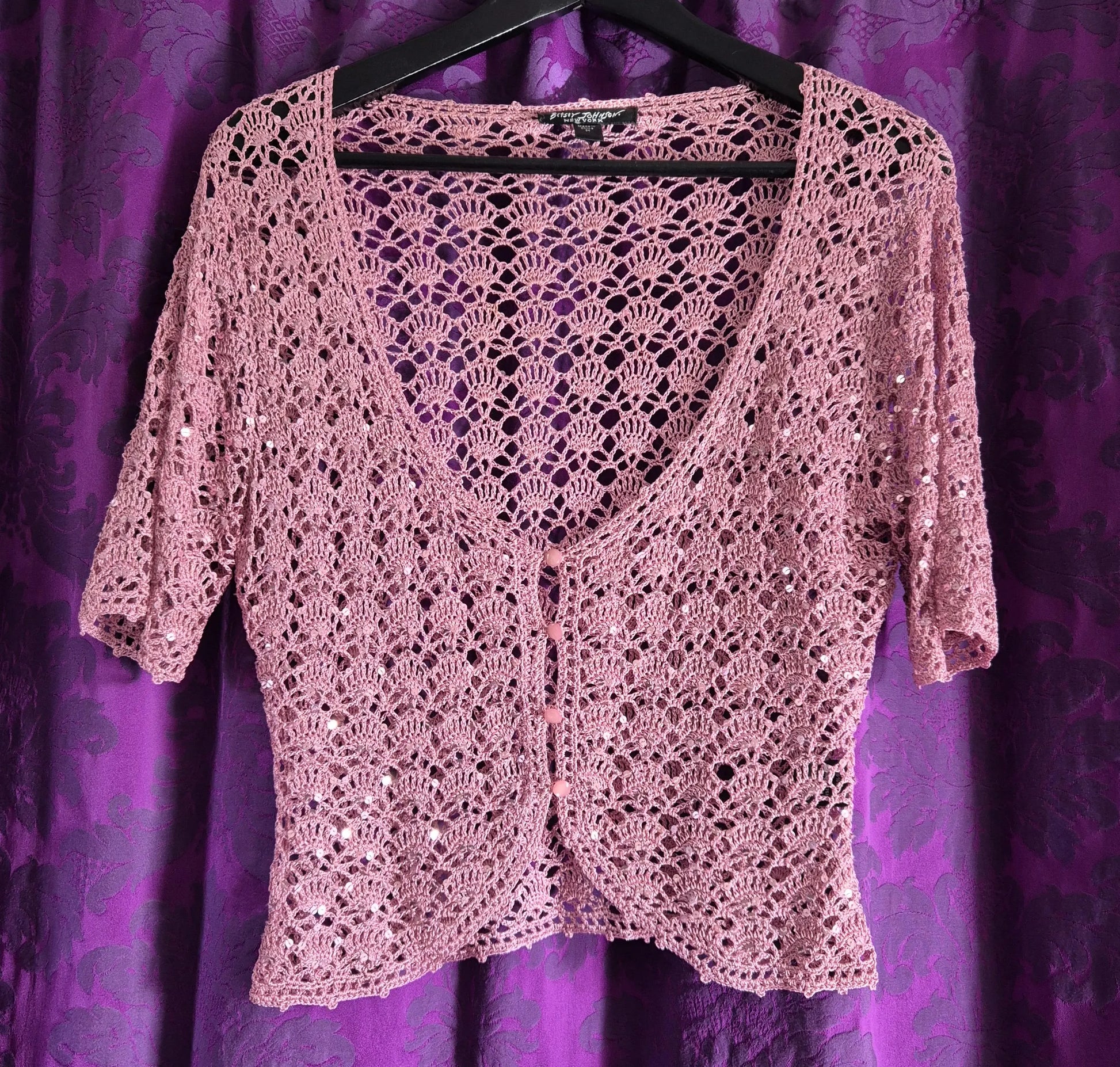Dusty rose pink crocheted cardigan embellished with sequins. Romantic late 90s / early 2000s ultimate Betsey Johnson whimsy/fairy delight! Low scoop neck, closes with little pink pearlised buttons. Ideal for layering over strappy tops, slip dresses or contrast lingerie.