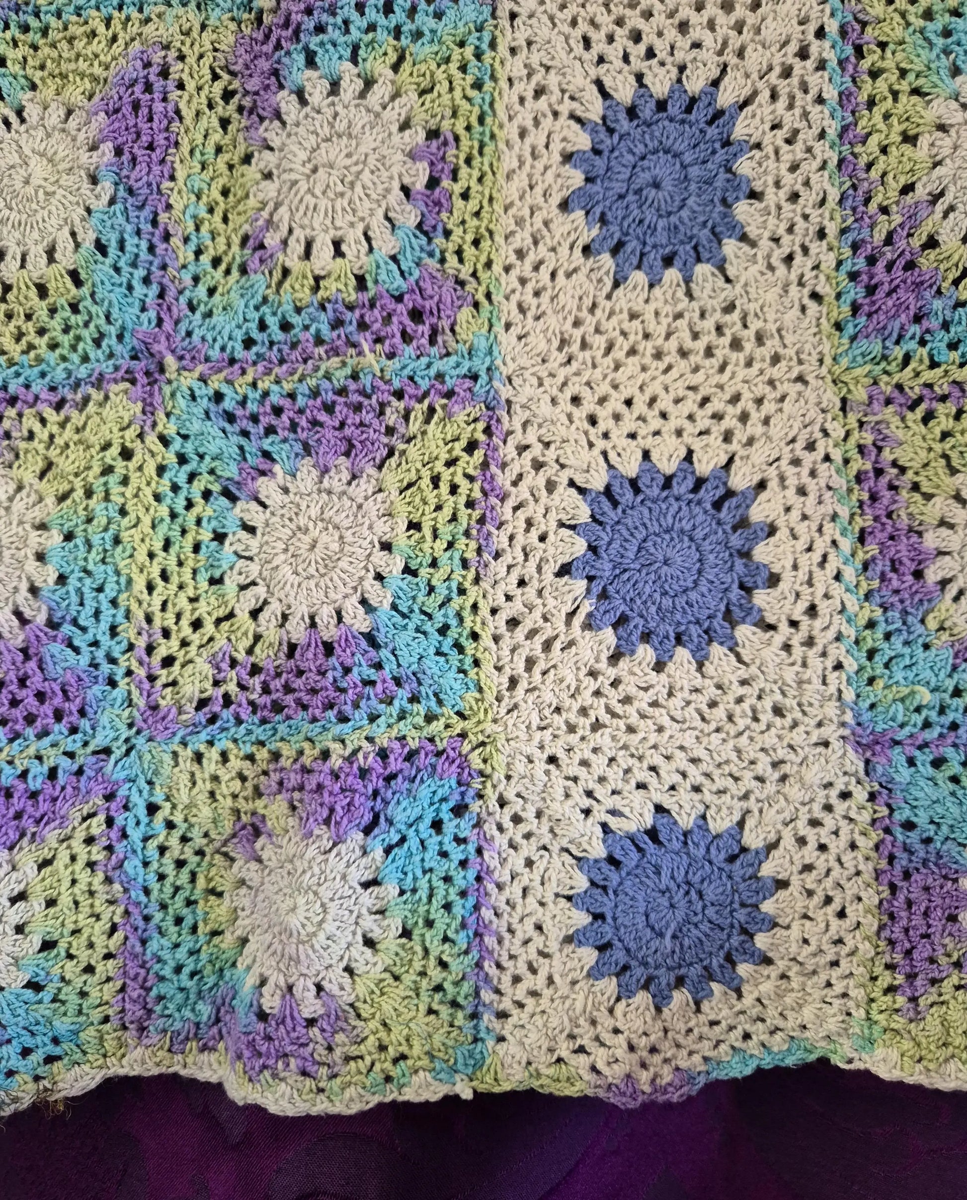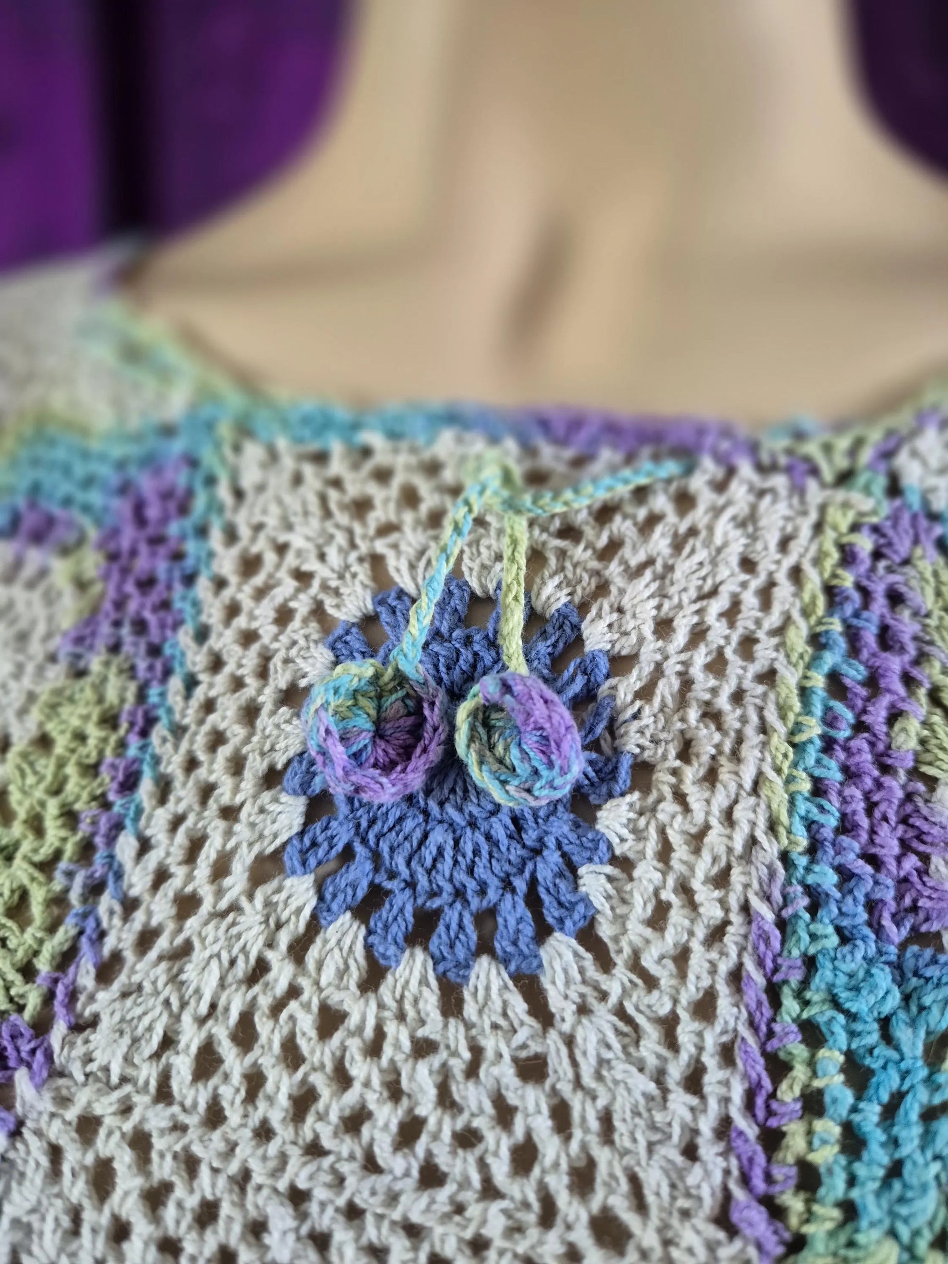 Utterly exquisite handcrafted blouse in delicious shades of lavender, blue, pale green and cream. Clever use of the grid to create an almost psychedelic effect. Soft cotton yarn skilfully crocheted to fashion a stylish, timeless and one of a kind piece. Lace around then neckline can be adjusted for a tighter fit and the tails have the most gorgeous detail - circles on the ends.