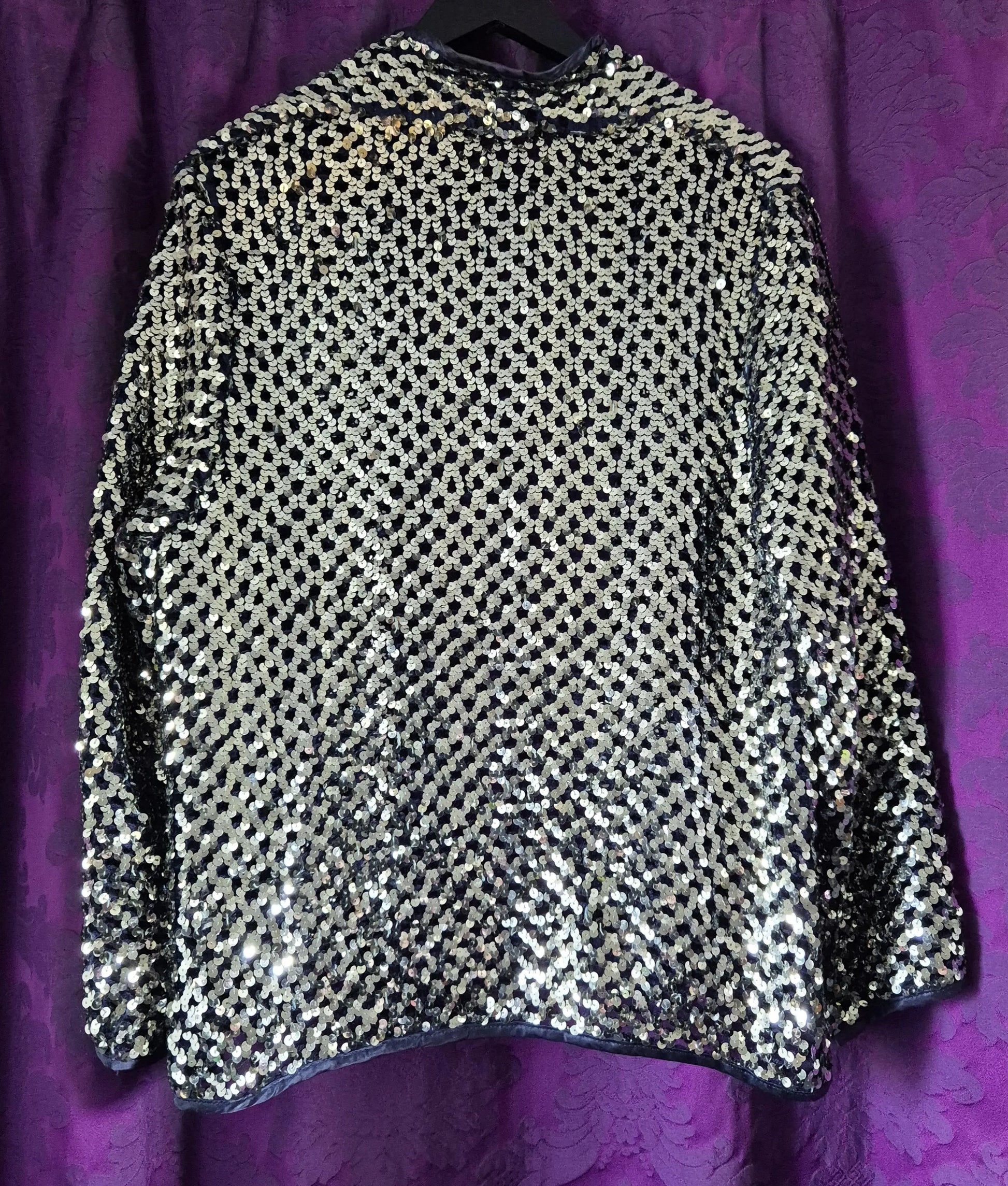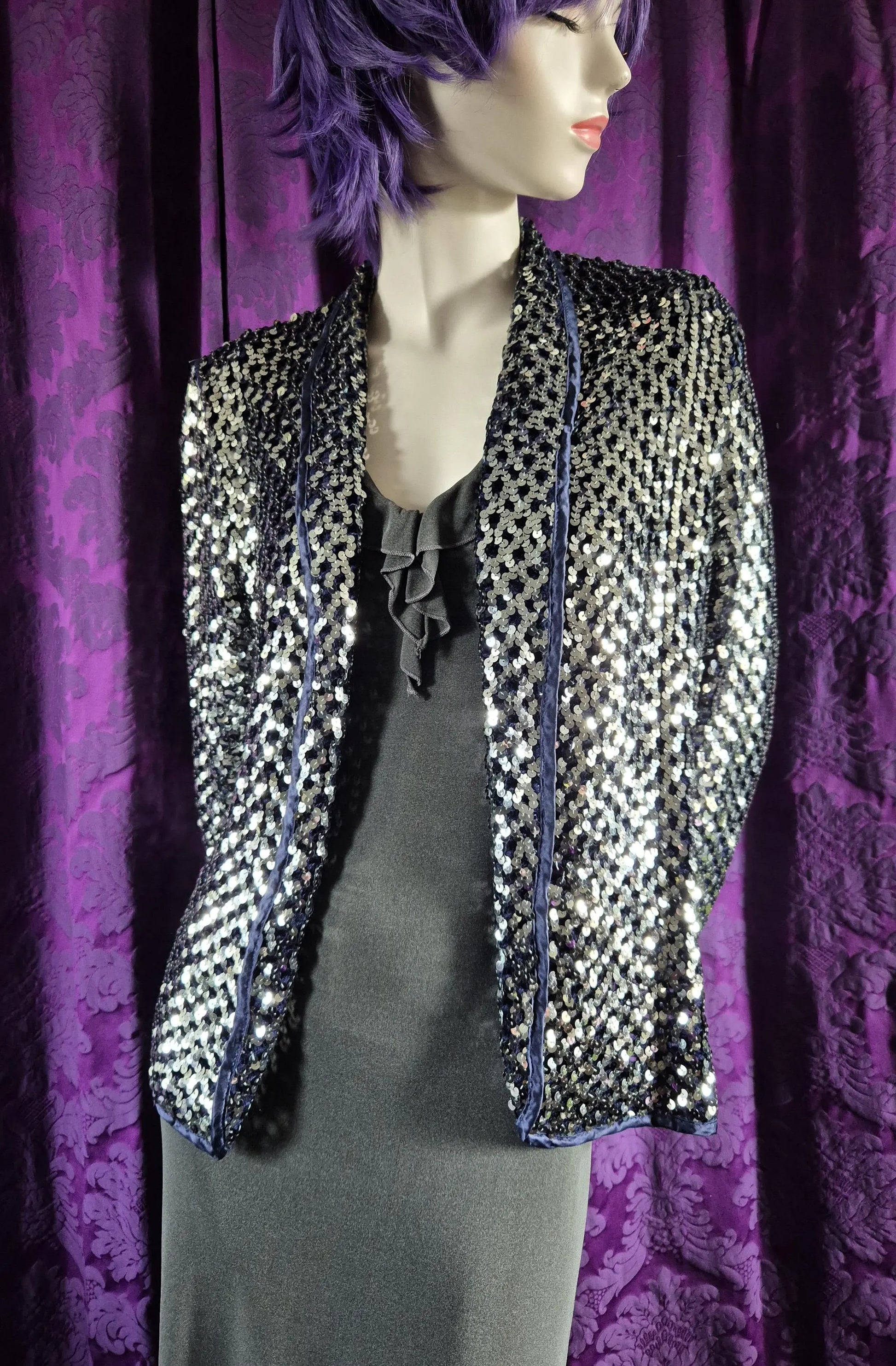 Extreme sparkle silver fishnet knit hip-length jacket. The knit is navy blue and this enhances the contrast and lustre of the sequins. All edges bound in blue satin. Shawl collar and no fastenings. Makes for a versatile and easy-to-wear party piece that is classic and destined to be the life of any party.