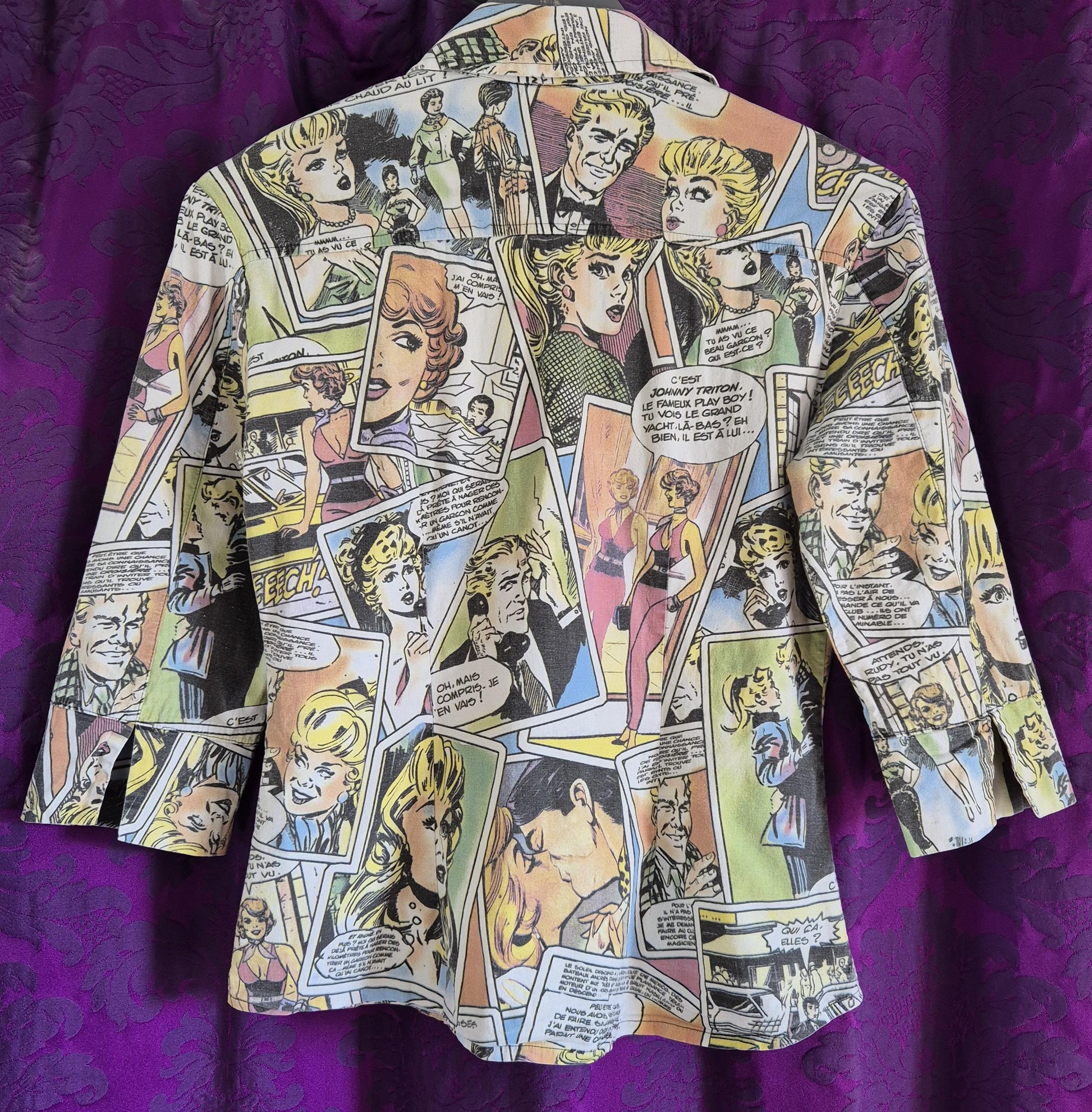 Super cool retro comic strip print tailored blouse. Y2K does 60s style and with a fitted shape and stretch. Faded effect colours intentional to make it look more like old newsprint. Made in Italy by "Primavera" but the captions on the comics are all in French!